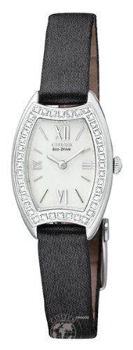 Silhouette Diamond (40 Diamond) - Two-hand solar-driven movement featuring Eco-Drive technologies, Insufficient charge warning and overcharging prevention features, Polished silver-tone hour and minute hands, Applied and polished silver-tone Roman numerals mark quarter hrs, Applied and polished silver-tone stick hour markers, Analog display, Polished silver-tone stainless steel lozenge-shaped scenario encrusted with forty diamonds, Stainless steel caseback, 30 meters/one hundred feet water resistantFeaturing